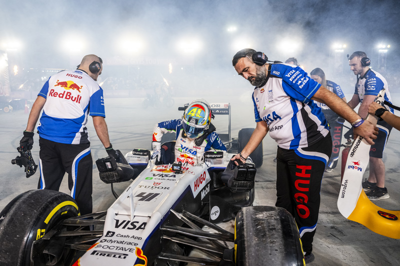 As part of the Red Bull Moto Jam celebration, the VCARB-branded RB8 also marked the occasion of Holi, India’s famous festival of colors, which took place on March 3. Continuing a tradition established during previous Red Bull showruns in India, the car released clouds of coloured powder (gulal) into the air, creating a spectacular visual tribute to the local celebration.